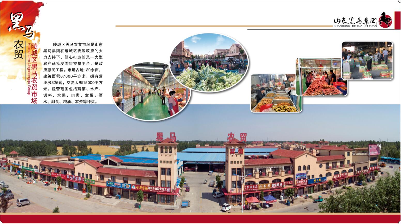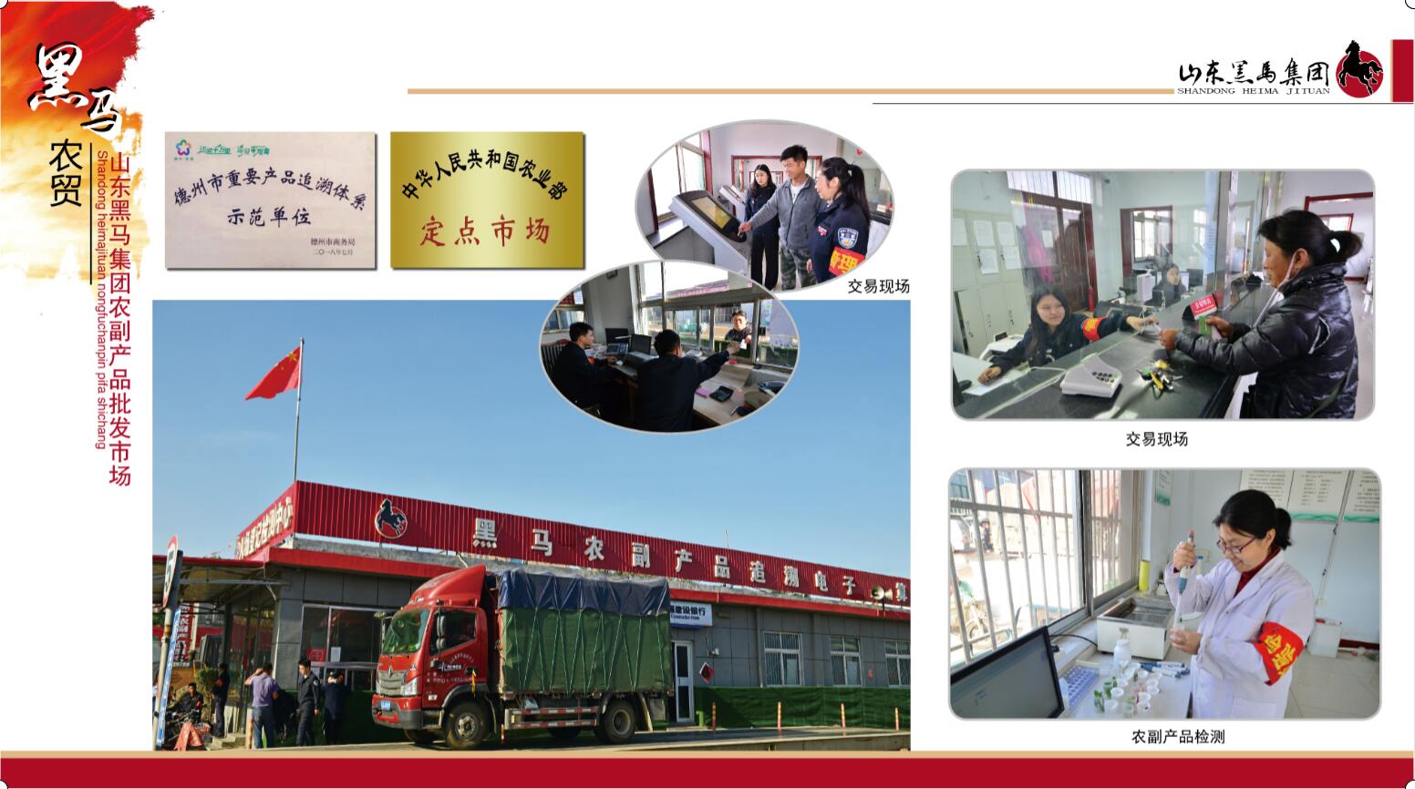 黑馬農(nóng)貿(mào)批發(fā)市場是國家農(nóng)業(yè)農(nóng)村部定點(diǎn)市場、山東十大專業(yè)批發(fā)市場、山東省標(biāo)準(zhǔn)化市場、德州農(nóng)業(yè)產(chǎn)業(yè)化重點(diǎn)龍頭企業(yè)、魯西北最大的農(nóng)產(chǎn)品集散地、魯西北農(nóng)產(chǎn)品價(jià)格形成中心和發(fā)布中心,是德州市“菜籃子”重點(diǎn)工程,是國家農(nóng)業(yè)部鮮活農(nóng)產(chǎn)品定點(diǎn)市場、市場競爭力百強(qiáng)市場、山東省十大綜合批發(fā)市場,是全國農(nóng)產(chǎn)品市場協(xié)會理事會成員,是魯西北、冀東南地區(qū)規(guī)模最大,交易額最多的大型蔬菜集散地。