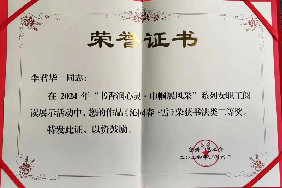 在“三八”國際婦女節(jié)來臨之際,德州市總工會組織開展了“書香潤心靈,巾幗展風采”系列女職工閱讀展示活動,黑馬集團工會積極組織女職工參加了本次活動。其中,黑馬集團女職工李君華的書法作品《沁園春·雪》榮獲書法類二等獎。