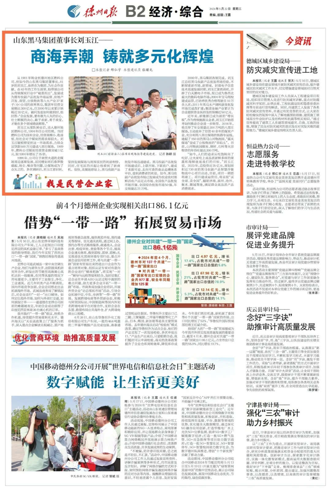 5月22日,《德州日報(bào)》推出“我是民營企業(yè)家”專欄,展示德州民營企業(yè)家改革創(chuàng)新的風(fēng)采,本期以“商海弄潮 鑄就多元化輝煌”為題,刊登了對山東黑馬集團(tuán)劉玉江董事長的報(bào)道。劉玉江董事長在43年的工作生涯里,堅(jiān)持開拓創(chuàng)新,帶領(lǐng)黑馬集團(tuán)從傳統(tǒng)煤炭行業(yè)中“破繭而出”,發(fā)展為商界黑馬。劉玉江表示:企業(yè)發(fā)展,要有敢為人先的信心、壯士斷腕的決心,敢于求新、勇于求變,才能在多個(gè)領(lǐng)域鑄就輝煌。