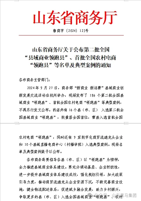 近日,山東省商務(wù)廳公布了第二批全國“縣域商業(yè)領(lǐng)跑縣”、首批全國農(nóng)村電商“領(lǐng)跑縣”等名單及典型案例。山東黑馬集團(tuán)有限公司入選商務(wù)部數(shù)字化商貿(mào)流通龍頭企業(yè)典型案例。