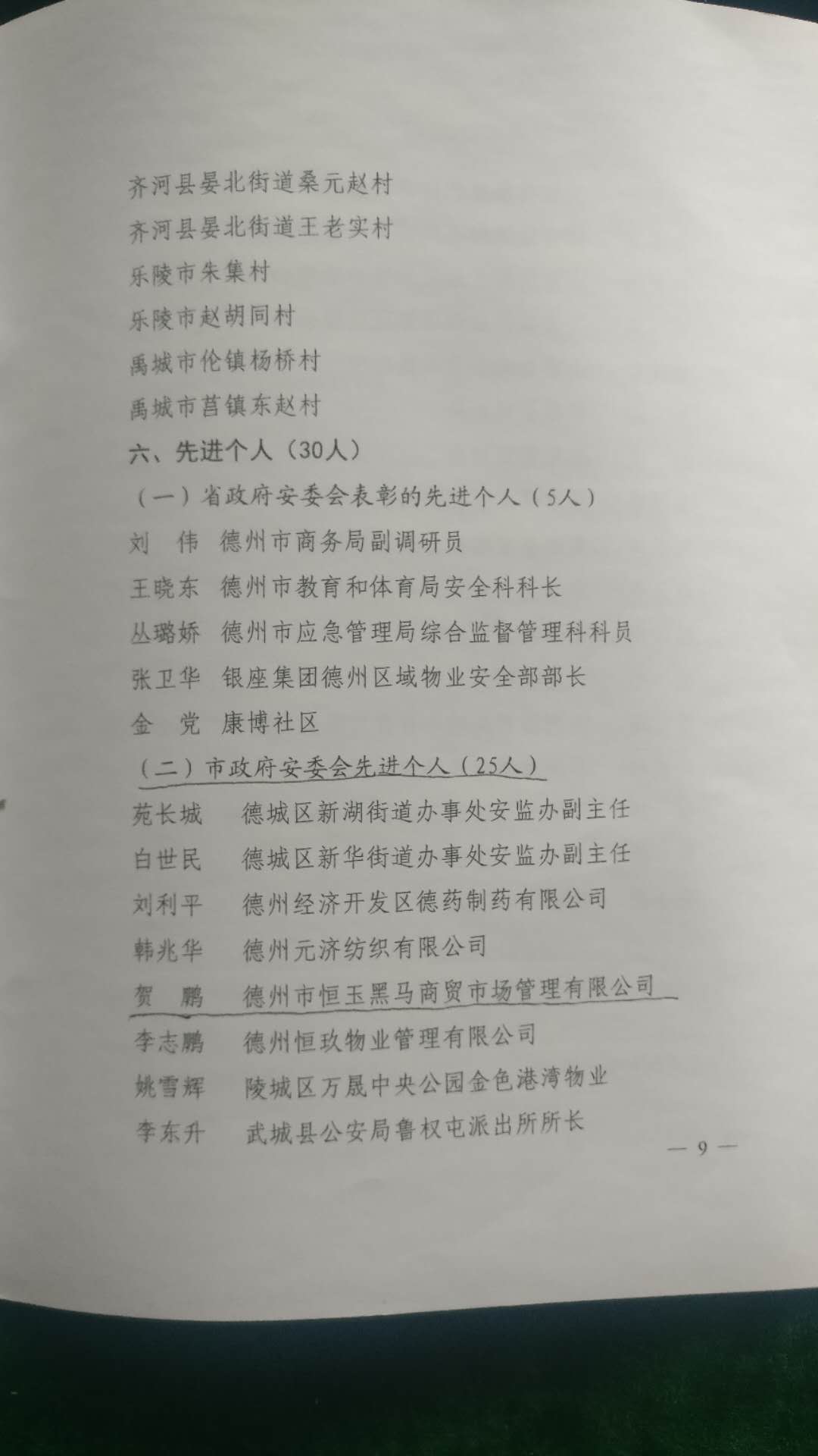 近日,黑馬商貿(mào)市場因出色的安全管理,受到了德州市人民政府安全生產(chǎn)委員會(huì)的表彰,被評為“市政府安委會(huì)先進(jìn)單位”。黑馬商貿(mào)市場負(fù)責(zé)人賀鵬被評為“市政府安委會(huì)先進(jìn)個(gè)人”。