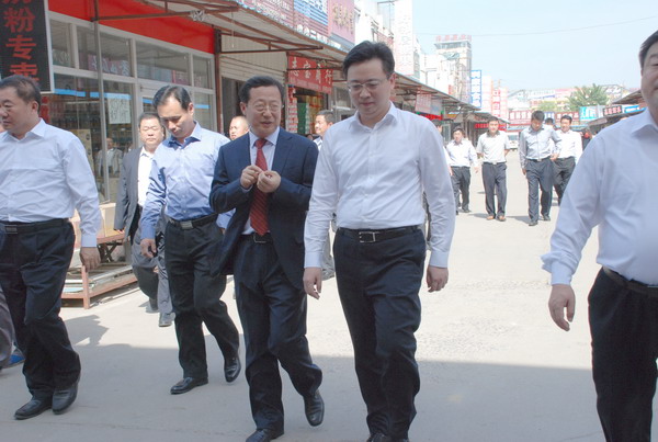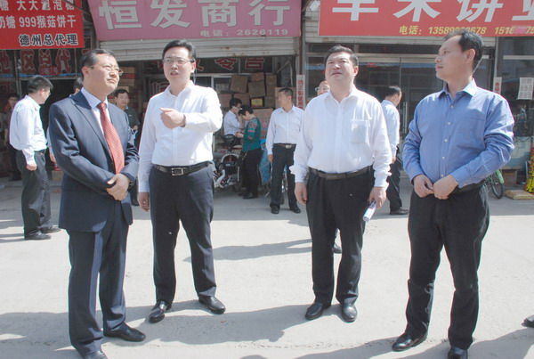 2015年5月13日,德州市委副書記、代市長陳飛在運河開發(fā)區(qū)黨工委書記、管委會主任樊兆杰的陪同下來我集團商貿(mào)市場視察指導(dǎo)工作。集團總裁劉揮進等領(lǐng)導(dǎo)班子成員參加,總裁介紹了集團和商貿(mào)市場的情況。陳市長詳細了解了黑馬集團的經(jīng)營管理情況及商貿(mào)市場的概況,對集團去得多成績給予肯定,并要求做好市場安全管理工作,不斷做強做大專業(yè)市場運營。